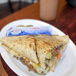Quesadilla comes with New york steak, Also comes with mozzarella cheese, avocado, grilled tomatoes and onions, mayo, mustard inside. On the side: Pickled peppers, and hot or mild sauce.