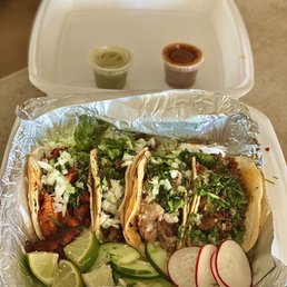 Pork in Mexican herbs served with pineapple, Each taco comes with corn tortilla's, Served with cilantro, raw and grilled onions. With a side of cucumbers, and radish, Fresh Limes, Hot or mild sauce on the side.(price per taco)